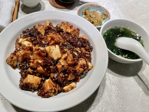 【麻婆豆腐かけご飯/1000円/税込】 麻婆豆腐丼、スープ、搾菜がセットになったお得ランチです。 ◼︎麻婆豆腐丼 大きな丼の中にたっぷりの麻婆豆腐。 その麻婆豆腐はトロトロ餡です。 そして豆板醤ですかね。その辛味に甜麺醤豆豉などのコク。更に花椒ですかね。痺れ感も多少あります。 んんー、フーハー、フーハーと食べる麻婆豆腐は旨辛です。