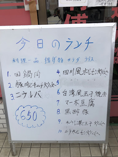 Read more追記 2023年1月早々 8ヶ月ぶりに再訪しました。 日替わりランチ税込715円の回鍋肉を注文。 見たこともない色の回鍋肉が出てきてビックリしました。 もちろん味も回鍋肉ではありません。 豚肉とキャベツのピリ辛炒めのようでした。 付け合わせのサラダは大根のみ、 スープは味も無くドロドロのワカメが不味い、 ご飯も不味い、デザートのオレンジはカピカピに乾燥してました。 ランチ時間帯なのに店内のテレビはオフで 赤ちゃんの鳴き声だけが響き渡ってました。 他にも小さな女の子が店内で遊び回ってて、 託児所に来てるようです。 まったく行く価値のない店です。