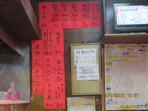 Read moreやっと訪問することが出来ました。(^^)/ と言うのも前回訪問した時には、お昼の時間帯を10分ほど遅れてしまったため購入することが出来なかったんです。 今日は、お彼岸の帰りにお店の前を通った時に夕方の部の開店2分前だったのでお店の前で待つことにしました。 ご主人が開店の札を変更すると同時に入店しました。 初めての訪問なので、 「餃子を持ち帰りたいのですが」 「はい、おいくつですか?」 「初めてなので餃子の大きさはどのくらいですか?」(時々馬鹿でかい餃子だったりするので。。。) 「大きさですか。。。小さいとは言われたことがないですね」 「じゃ、1人前とかありますか?」 「はい、10個で810円になります」 「じゃ、30個ください。」 「生で?」 「いや、焼いてください。」 「10分ほど掛かりますのでお座りになってお待ちください。」 気の良さそうなご主人です。 帰宅し、夕食時に家族で食べてみました。 モチモチとした厚めの皮の触感がとてもよく、具の香りや触感に独特感があって専門...