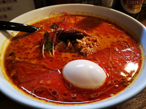 で、程なくやって来たのは如何にも美味そうなルックス(≧∇≦)b スープからいただきましたが… 美味い!!さすがかっては「炎」という名で坦々麺をメインでやっていたのは伊達じゃない。なんというか胡麻胡麻し過ぎていないクリアー感に しっかり嫌味のない辛さと痺れ⚡こりゃ久しぶりに美味い坦々麺に巡り会えました!縮れ気味の太麺もなかなかですし具材がエリンギ入ってたりとちょっと個性的なのも気に入りました。味玉もこだわりを感じるご飯に乗せても美味かろなな逸品でした。 コレはリピ間違いなし(*^^)v 次回は醤油ラーメンか個性的な醤油つけ麺塩ライムかなぁ(´`)♪