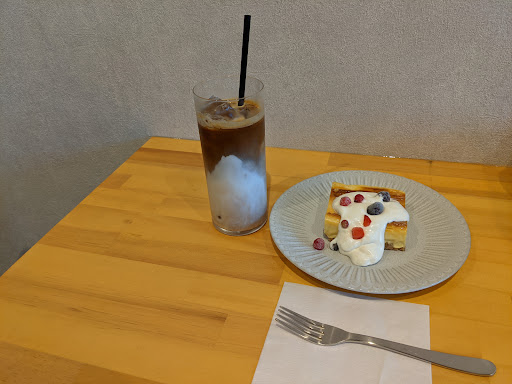 アイスコーヒーとチーズケーキ到着! アイスコーヒーは、スッキリした飲みごたえで、美味しかったです(・∀・) チーズケーキも、甘過ぎず、に美味しかったです😋(ボリュームあった〜:(...
