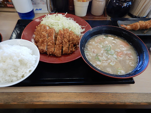 メニューはメインのカツ丼のほか定食も多い。 以前入った時は豚汁定食のロースカツを注文。 本当はロースカツ定食が食べたかったのだが、注文時に見誤って豚汁定食の方を注文してしまった。 しかし、豚汁定食はロースカツが付いているのに、ロースカツ定食の方が料金がほんの少し高いのは謎。 カツの量や大きさが違うのだろうか? 豚汁定食は豚汁がメインなので器が大きく、ロースカツの量も申し分ない…が、味は至って普通。 カツに関しては自分の妻が作った方が美味しいのでは?と感じる程、上手くも不味くもなかった。