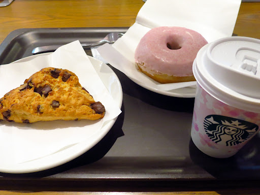 Strange problems with the Wi-Fi forcing me to dictate this review for later. But it doesn't seem to be just the Starbucks Wi-Fi, but also my own, so unclear if it counts against this Starbucks. Anyway the restaurant is kind of interesting decor with probably 60 seats in a kind of zigzag arrangement. Only eight seats with power for charging. But apparently some kind of rule about buying something every hour? Strangest thing is a bunch of things on the ceiling that looked like pull-down screens. One of the employees said they did pull down, but that they were not screens for projecting, but for something else.