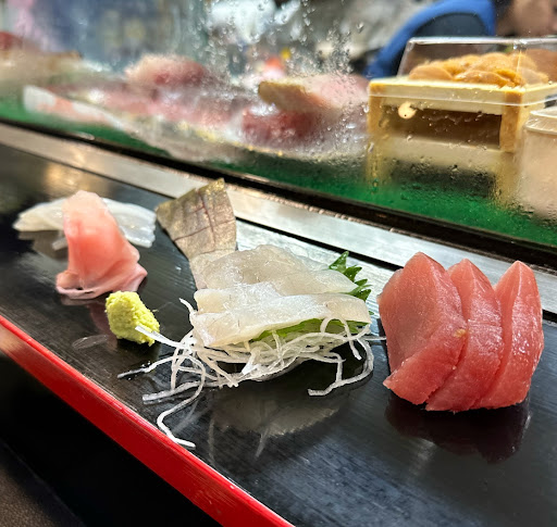 由於兩人食量都不大,只點了壽司拼盤、魚生拼盤和烤魚。壽司拼盤和魚生拼盤都是每製作完一種類食材就放到面前的,並不是一整個盤子上菜的,可以讓客人等待食物的時間縮短。