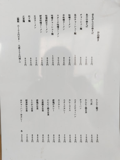 日曜開店ちょうどの時間に到着したのだが すでに客は中に入って料理を待っている状態。 駐車場は店舗前の砂利スペースに5~6台ほどか。 カウンター9~10席のテーブルが3卓ほど。 地元客がメインのお店のようだ。 中華なのだが料理の出てくる時間は客の多さに比例して長い。中華にしては長い。 昔ながらの中華そば(ラーメン)と店の一押し ニンニク焼き定食を注文。
