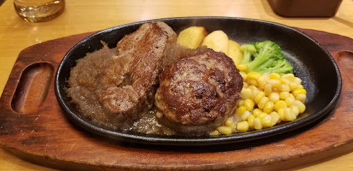 Somehow, a steak house is one of the best vegetarian options in the whole prefecture. At the moment you can buy any 120g hamburg steak meal and substitute the meat for a soybean patty. The salad bar has good options too but not everything there is wholly vegetarian.