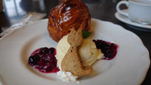 The apple pie is typically served with a dollop of rich vanilla ice cream on the side or a refreshing spoonful of sour berry jam. To add a charming touch, a cute little cat cookie is decorated! (If I'm not wrong, the flavor of the cookie is Earl Grey.)