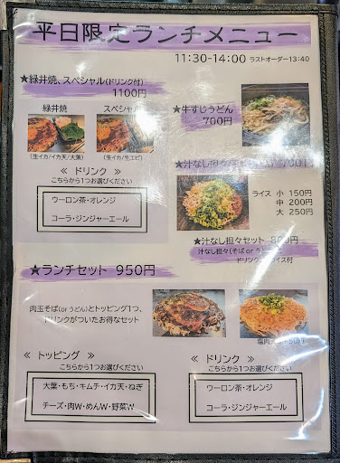 Read moreお昼の平日ランチセットをいただきました。 セットは、ノーマルお好み焼き、トッピング1つ、ドリンクのセットで950円。 トッピングの+1種は麺ダブルや野菜ダブルが選べるから良心的だけど、正直普段ドリンク注文しない人にはあんまりお得感無いのかもなぁ。 お好み焼き自体はかなりの麺パリ系、どちらかといえば麺バリ系で、五日市の「ぼう」とか横川の「日々来」みたいなタイプ。 こういうタイプはとにかく濃い味でビールに合うのがセオリーみたいなところがありますが、こちらは味付けはソースは強いけどそこまで濃い味な印象は無い感じでした。 サラッとは食べれるけど、なんだかちょっと独特な苦みみたいなのは少し気になったかな。 夜の鉄板焼きメニューも豊富みたいなので、場所柄なかなか難しいですが是非夜にも一度お邪魔して...