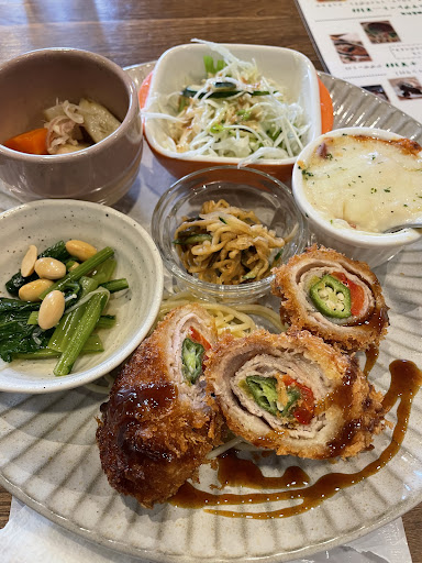 近くの整形外科へ行った際ちょうどランチ時間になり、肩の痛み止めの薬をすぐにのみたいのもあって近くのこちらのお店へ。 原付きの停め場所がわからず中にいらした女性の店員さんに場所をうかがうと、お店の横にあるスペースを教えていただいたんですが、10センチの段差があり、左肩に激痛がある私にはとても停められない、出すことも出来ない状況‥ 車を停めれる駐車場は道路向かいに3台分ありそちらに目をやるとやはり10センチの段差が(T_T) あ、これは肩が治ってからでないと無理かなとしょんぼりしている私に 「あ、私が動かしますよ」 と段差を上げてくださり 「お帰りのときもおろしますよ」 とご親切におっしゃるその優しさとお人柄に本当に感謝しかありませんでした。 お料理は日替わりランチで野菜もふんだんに使われており、ヘルシーで美味しくて大満足でした! 店内はお洒落で外向きのカウンターもあり、平日のお昼12:30過ぎた頃でしたが女性のお客さんがたくさんおられました。 息子たちは中華やお寿司を好む為、次回は娘を連れてお邪魔したいと思います😊 本当にありがとうございました...