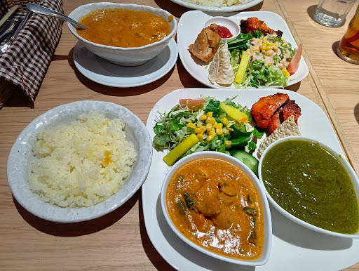 Read more数日前から口がインドカレーにはこちらのお店が駐車場があるようだったので訪問! 外観、内装は今どきで女性客を意識した?感じがしました。(外国人のオーナー自ら手掛けた内装じゃなくて日本のプロの内装) 店内の空いた席を勧められ座るやテーブルにはナンなどの欠片が…。無言で別の席に移るがそこも同じ…。店員さんに声をかけて先に拭いてもらいました。食器下げるだけで拭かないのか?メニューはだいたいどこの店とも変わりはない。ランチセットの内容よりも、レギュラーメニューにあった店の名前が付いたセットを注文しました。500円も差がなくてカレーも2種類、サラダ(しっかりな量)チキン、パリパリのヤツなど付くので色々楽しめるかなと。 セットの飲物を食後にお願いしたら、店員さんはコチラからの目配せがなければずーーっと気付いてはくれなかったかも。昼時でしたが店内は全然空いていたのに。 厨房はおそらくインド?ネパールの方々がおられ、表を皆さん若めな店員さんたちが担当かと。飲食店ゆえの気配せ目配せがもっとあればきっとより良い店になるのかと思いました。 細かなことをいえば左に目をやった際の窓辺のホコリは...