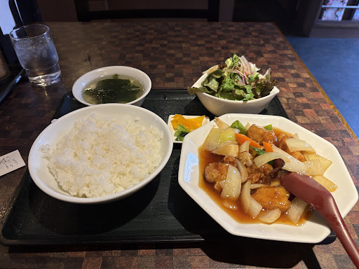 午前中でしなくてはならない用事を済ませ、暇になったので前から気になっていた翠来軒さんへ。 高級広東料理を提供しそうな外観で、敷居が高そうと思ってましたが、メニューはリーズナブルな町中華仕様となってました。 初めての中華料理屋は名物料理が無い場合は酢豚定食を食べると決めているので、迷わず酢豚定食1,000円をオーダー。 12時25分に来店し料理が出てきたのは、12時45分となかなか待つ事に、ご夫婦(たぶん、確認はしてない。)だけで営業されているようなので、タイミング次第では待ち時間が気になるところです。 ラインナップはご飯、酢豚、サラダ、中華スープ、漬物(ザーサイならなお良し)オーソドックスでありながらコスパの良い内容。 スープは良い意味で塩が少し強めで優しすぎずちゃんと主張してくれ、美味しかった。 酢豚は甘酢が好みではなかった。 自分には、甘さが立ちすぎていてご飯に合わすには少し厳しかった。 にんにくが効きまくってたりしたら、また違ったかもしれませんが。 あと、レンゲに白い粉が付着していたのが気になった。 おそらく、片栗か小麦粉が洗った後に付着したのだと思いますが少し残念。 店自体は、静かで落ち着いた雰囲気でした。 次は違うものを食べてみます。 なお、10年以上前に何度か利用した天満町にある歩の酢豚が美味しかったなーとふと思い出...