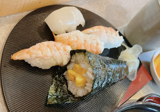 というわけで、こんなにエビがモリモリのお寿司になったのだ!🦐🦐🦐🦑🥚 (後から来店したお客さんの寿司定食を見ると、マグロ カンパチ エビ イカだった)