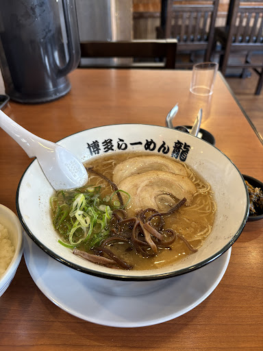Read more観音近辺で駐車場があるお店はとぐるぐる回っていたら、気になっていたラーメン屋を思い出し「龍」さんへ入店。 替え玉50円の魅力的な文言に興味深々。 半チャーハンセットと迷ったけど、最近のおいしい餃子が食べたい欲望に負けて、黒龍ラーメンとライス、餃子のセット(980円)をオーダー。 まず、ラーメン。スープはとんこつ臭は無く、飲みやすい。 塩気はやや強めだが、甘さ、旨みも強いので 気にはならない。 久しぶりのとんこつラーメンだったけど、とんこつラーメンはこうだったと思い出させてくれるそんな一杯。 ご飯のかたさもちょうど良い。 餃子は小ぶり(市販の餃子の半分くらい)。 好みではなかった。サイズ感意外は印象に残らなかった。 高菜と紅生姜、生ニンニクがセルフになっているのが良い。 また、高菜が辛そうに見えてそこまで辛く無くご飯に合うのも良い。(辛いの苦手なので) 替え玉一つ頼んで1,030円で退店。 予算30円オーバーだけど、美味しかったので満足です。 提供早いし、セルフがある事もちゃんとアナウンスしてくれるし、接客も良いのもプラスでした。 的場町にある「ひよこ」の高菜には、衝撃を受けたのを思い出した。 高菜が甘い、とにかく甘い。最初は戸惑ったけど気づけば高菜だけで白飯食い終わってた。クセになる高菜。 ラーメンも大盛り550円。(変わってなければ)しかもうまい。まーまー臭い。当分いってないけど好きな店。 博多ラーメン龍はまたリ...