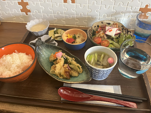 I went for lunch while visiting Hiroshima with my 11 year old son. The food was exquisite and 1200 yen for a filling lunch set with multiple creative elements with lots of fresh and beautifully prepped ingredients. My son had a kids meal which he loved and was so pleased enough to suit his taste while still being Japanese :). Some of the best food I’ve eaten while in Japan and the person serving was polite, kind and attentive. The cafe was full of local women with their kids and older women lunching together - a very pleasant, inviting atmosphere. I can’t...