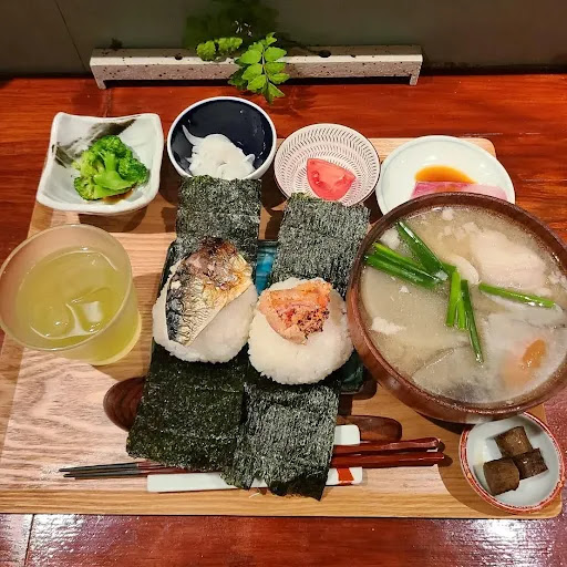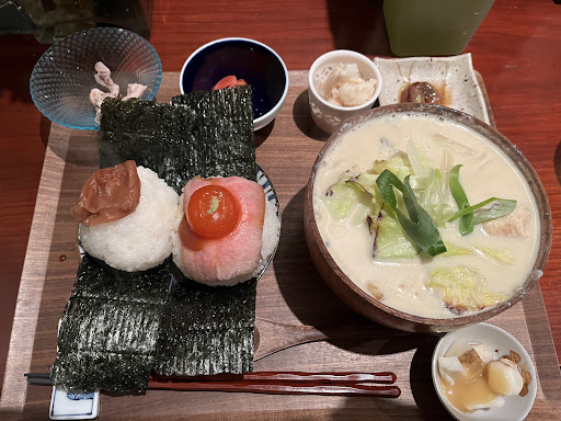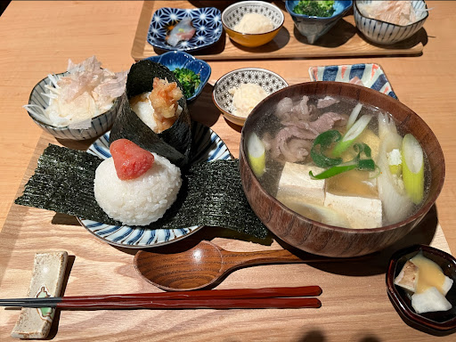 Read more友人に勧められ、おむすびと汁物のランチ目当てで夫と伺いました。 10時数分過ぎに着いたものの既に満席。40分ほど待ち入店。あらかじめメニューのオーダー表を渡されたので、それにチェックして店員さんに渡して注文は完了。汁物とおにぎりの具がどれも魅力的すぎて悩みましたが、明太子おにぎりと肉吸いと小鉢5種のセットに、欲張ってもう一つ海老天むすを追加しました。 大椀にたっぷりの肉吸いとおにぎり2つ、小鉢はお刺身1切れ、クワイの酢味噌をかけたもの、ブロッコリーの辛子醤油和え、ポテトサラダ、オニオンサラダでした(ちなみに小鉢の説明はなかったので、料理名はあくまで推測です)。 どれも丁寧に作られており概ね満足ですが、肉吸いの出汁の酸味が強く、これはそういうものなのか煮立て過ぎなのかが気になりました。あと、おにぎりは、海苔の上に薄味の(無塩のような?)球体のごはん、その上にちょんと具が乗ってる形で提供されるのですが、どうやって食べるのが正解なのか悩みました。海苔で包んで上からガブっといって大好きな明太子が1口で終わってしまい、後が寂しかったです。それを見た夫はあらかじめ海苔を使って上から具をごはんにめり込ませて横から食べていました。海老天むすは外に飾り付けてある海老天に加えて中にも海老が入っており、薄味で油っぽくもなく美味しかったです。おにぎりと汁物の塩味のバランスを、交互に食べて丁度良く仕上げてあるのかなとも感じましたが、それでも肉吸いがややしょっぱいかなとも思いました。