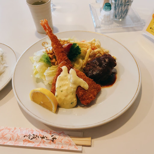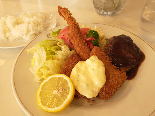 テーブルにはメニュー。 日替わり弁当690円、サンドイッチセット840円、スバゲティ700円推しだね。 歳を経てメイド服でない店員さんへのオーダーは、めったにこないこの辺り、スペシャルランチ900円。 10分程度後、やってきましたスペシャルランチ。 皿に盛られたライスと、サラダ、ポテサラ、エビフライ、魚フライ、ハンバーグのワンプレート。 そして、ナイフとフォークでなく箸。 サラダにはゴマドレで今時の味。 ポテサラは玉子たっぷりで昔ながら。 魚フライは揚げたて、ちょっとタルタルソース甘めかな。 エビフライも揚げたて、尻尾の揚がりもいい感じ。 そして、ハンバーグ。 つなぎが少ない肉肉しさ、そして甘めのソースで昭和な味わい。 小学生くらいの頃食べてたのコレだったのかな~