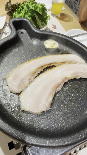 今回は、サムギョプサルも注文! 分厚いお肉が2枚...