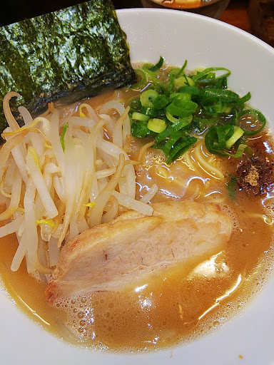 ●再訪追記R5.10下旬 赤カラ塩とんこつラーメン(750円)をいただきました。驚きがあって美味しかったです。カウンター席について口頭で注文。しばらくして着丼。真紅の辛味油が乳白色のスープに彩りを加えている。まずは辛味を混ぜずスープと麺を味わう。塩豚骨のスープは程よいトロミがあって、嫌味のない豚骨のコク深い旨味がある。細目の麺は歯切れよくスープを引き付けてうまく混じり合い美味い。辛味を混ぜると一気に汗腺が開くようなスパイシースープへと変化した。それはクミンのような香辛料系の辛味で意表を突かれたが、塩とんこつスープにはとても相性が良かった。柔らかいチャーシューと美味く完飲完食。ごちそうさまでした。茹でモヤシだけがクタッと水っぽく元気がない様子でした。 ●初回訪問 味玉醤油とんこつラーメンと豚のっけ飯のランチセットをいただきました。美味しかったです。(ランチセット900円+ワントッピングで1000円)着席して口頭にて注文。チャーシュー飯にマヨネーズ有り無しを聞いてくれます。もちろん有りでお願いしました。着丼、丼面にはチャーシューを手前中心に立体感を持たせてバランス良く並べられたトッピングたち(チャーシュー1枚、ゆでモヤシ、ネギ、海苔、煮卵、魚粉少々)。スープは、豚骨が出過ぎずカエシは穏やか、野菜と鳥の旨味のあるまろやかなポタージュを思わせる味わいのスープ。老若男女に好まれる味だと思います。麺は中細パツッとした良い歯ごたえのある麺でスープを良く絡めます。特筆すべきは煮豚のような厚目のチャーシューです。柔らかく肉の旨味を感じる優しい味でスープを邪魔しません。もう一枚トッピングしておけばと後悔。さらに煮卵。味が染みた見た目、半熟黄身のツヤっぽさに堪らず口の中へ。スープとねっとり濃厚な黄身を味わいます。魚粉はあえて残しておき、中盤で机上にあるゴマ(ホールタイプ)と粉コショウで味変を楽しみます。この魚粉は少量ながら劇的に味が変化します。もう完飲完食必死ですね。ここで豚のっけ飯忘れてません。細切れチャーシューの上にネギときざみ海苔、マヨネーズがかかっています。さらにあの色っぽい煮卵の半分を乗せて、ゴマとラーメンスープを一すくいかけます。記憶なくなったかと思うほど瞬殺でした。味が濃いなと見えるけど濃くなく、薄いなと見えて薄くない。味をしっかり作られている一杯でした。ごちそうさまでした。 (駐車場は入り口前と対面のマンションにあります。空いていいればラッキー。近隣にはコインパー...