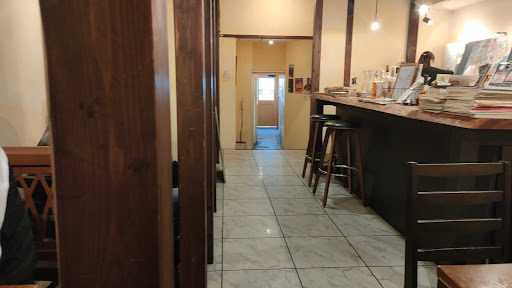 間口が狭く細長い空間のため店内の座席の配置は、入口付近のカウンターと店奥のカウンターにそれぞれ7席程、5席程あり、奥側には二人掛けテーブルが4卓ほど、といったやや窮屈な印象です。二階への木造階段がありますが、どのような使い方かは分かりません…。 トイレは広くはないですがウォシュレット付きで小綺麗に清掃が行き届いていて、女性も安心して気持ち良く使えると思います。