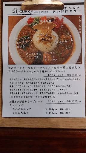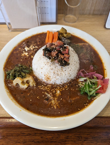 2024/05 カツオのたたきの和風カリー、スパイシーチキンカリー、豚肉のスパイシーカリーの三種あいがけを注文しました。 全体的に食べやすいながらちゃんとスパイスの効いたカレーで、チキンと豚肉のスパイシーカレーは同じ方向性ながら、カツオのたたきカレーはがっつり雰囲気が違うけど相性の良い馴染のある和風感。 各々でも美味しいけど混ぜ合わせながら食べるとまた良い感じになります。 でもこれならカツオのたたきと残りどちらかの二種あいがけでも良かったかな? 副菜も数種あってこれらもいろいろ合わせて楽しめるのもなかなかで、特に紫玉葱の酢漬けがアクセントとして抜群に存在感があってとても良い感じでした。 全体的に驚きは少ないながらも、安定した美味さと食べやすさのスパイスカリーといった感じなのかな。 これでもう少しお手頃だったら嬉しいんだけどなぁ。 ライス大盛りにしたら1830円だから、定番ランチにするに...