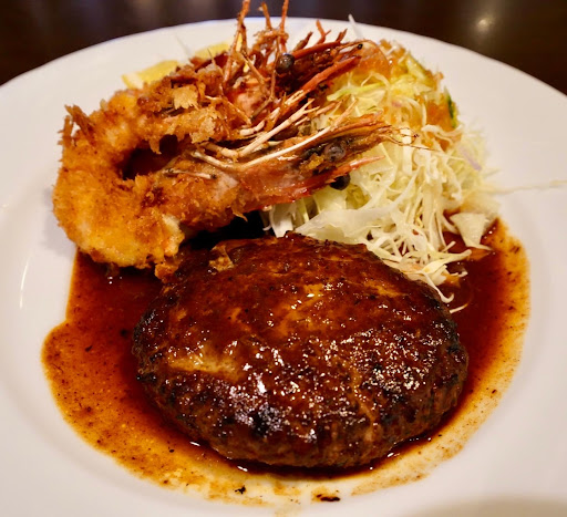 海老は大ぶりで、外サク中プリの最高の火の入れ加減。さらには特製のタルタルソース☀️これをいただくために海老を食べてると錯覚するほどに美味いです😍 ハンバーグは肉汁溢れるジューシーな仕上がり。さらにはお店特製のデミグラスソースがベストマッチ👍 いただいた後の余韻をずっと楽しめる奥深いソースに感服です。