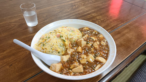 Read more名物のマーボー焼き飯を食べたくて、平日の12時過ぎにランチで訪問。 駐車場が11台分もあるのに、ほぼ満車で一台分だけ空いてて、何とか駐車出来ました。 駐車場も大人気(笑) お店は二階に広い座敷が広がり、そちらのテーブル席を案内されました。 私は普通のマーボー焼き飯800円、連れがマーボー焼き飯の大盛り1200円を注文。 出てきた大盛りは、写真ではよくわかりませんが、器の深さも普通サイズとは全然違って深く、かなりの量です。 普通サイズでも普通量の焼き飯に普通量の麻婆豆腐がかかっていて、これだけでもボリューム充分。 麻婆豆腐は日本の麻婆豆腐という感じで、辛さはほとんど感じません。 焼き飯はチャーシューではなく、ハムが入った懐かしい感じ。 これらがセットで妙に美味い。 具がネギだけのスープもごま油の香りがふわりときて、口直しにいい感じでした。 自分の普通盛りを何とか食べ終わる頃、連れは大盛りを食べ終わって...