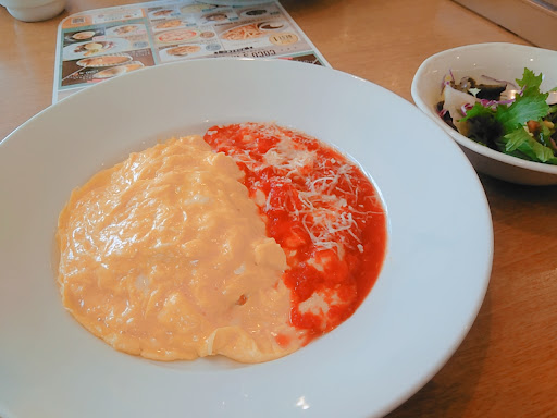 料理は、モッツァレラチーズのトマトソースオムライスとショコラベリーのクレープ、クリームブリュレをシェア。 オムライスは卵がトロトロ。ソースは酸味のしっかりしたトマトソースにモッツァレラチーズがたくさんはいっていました。 味は特別美味しいというわけではなくシンプル(けっこうトマトの酸味がきいている)ですが、モッツァレラチーズがたくさんはいっていたので満足。 クレープも¥290でこのクオリティーなら納得。中のホイップクリームが、生クリーム好きとしてはもっとクリームを追加してほしい(笑) もったりコクのある生クリームだけど軽く食べれました。 クリームブリュレは上の飴部分が少し厚みがあるのでもう少し薄くてもいいかなと言う感じでしたが中はミルクと卵の優しい味わいでした。