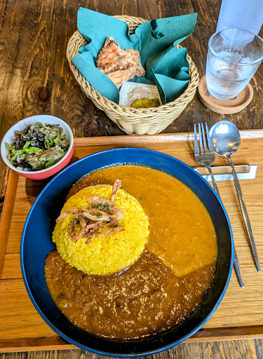 Read more平日14時過ぎにお邪魔しました。 すでにお客さんは一組しかいませんでしたが、各テーブルにはピーク時を垣間見れる片付けられてない食器類が並んでいて、さながら戦の後のよう。 それでもランチとして16時まで開いているってのがランチ難民にとってはとても有り難いお店です。 初訪問だったので、大盛りのあいがけ、唐揚げサラダセットをお願いしました。 少し待ってでてきた美味しそうなビジュアルのセットは、どこか大手町のデリーシャスのランチセットを思い出させるスタイル。 サフランライス(?)にフライドオニオン、トロトロ具材が煮込まれたルーはフルーティーで深みがあり、スパイスもしっかりと楽しめるタイプ。 籠に入ったフライドチキンはちょっとパサつきが気になりますが、ピクルスマスタードみたいなソースが酸味が効いててめっちゃくちゃ美味い! これは癖になるフライドチキンで、酒飲みたくなりますね。 なんだかんだトッピングしてたら良いお値段になりそうですが、これはかなりレベルの高いランチカレーのセットで大満足...