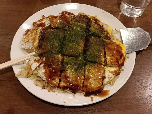 It's traditional Hiroshima Okonomiyaki and the soba is sooo crunchy; everything is just perfect in its simplicity. I didn't even top up the sauce, because the taste was just perfect as it was. Great portions, that are also good on the eye (made with care)! wish I could eat here over and over again!