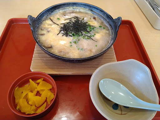 Read more日曜日の午後3時頃、遅い昼食をとるために立ち寄りました。駐車場があるのは便利が良いですね!少々狭めですが、駐車券も要らずの平面駐車場はありがたいです。 外の気温が高くて暑くてつい、冷たいものばかり食べていたので、胃に優しい雑炊にしました。 鶏肉としいたけの中華風玉子雑炊を食べました。 サラダチキンのようなヘルシーで、割いた状態の鶏肉がたっぷりはいってごま油の風味豊かな美味しいスープの雑炊で美味しかったです。 ジョイカフェも、注文していて、セルフでドリンクを取りに行きましたが、オレンジジュースが無くなっていたので、お店のスタッフに伝えましたが、結局私がお店を出るまで、対処してくれませんでした。 忙しそうだったので...
