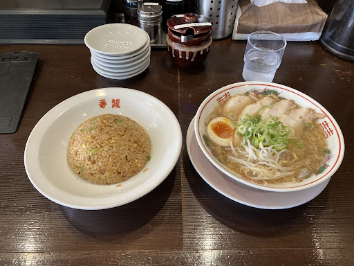 Read more開店10分後位に到着。恐らく5年は来ておらず久しぶりの来店ですが、15、6台はとめれる広い駐車場はほぼ埋まっており相変わらず人気のお店です。 赤香龍の並チャーハンセットを注文。所謂広島ラーメンで個人的には小鳥系の有名店にも匹敵する美味しさだと思います。少し浮いた背脂もこってりし過ぎずちょうどいい感じ。 ただ替え玉出来る店は普通ラーメンのタレが卓上に置いてあり、少なくなったスープに追加できますがそれがない。そのため替え玉の麺の後半はあまりスープに絡めて食べる事ができなかったのが残念でした。 もう一点、写真でも分かるように普通盛りのチャーハンが少ないかなと思いました。店によっては半チャーハン程度の量です。ここの半チャーハンはかなり少ないと思われますので...