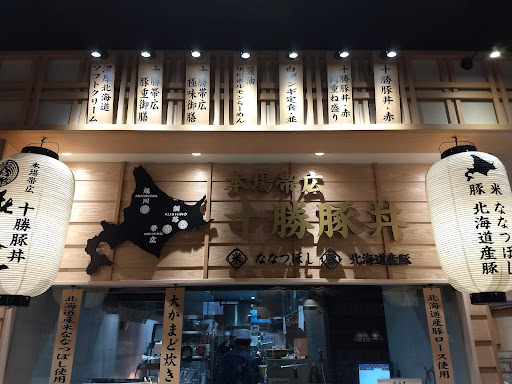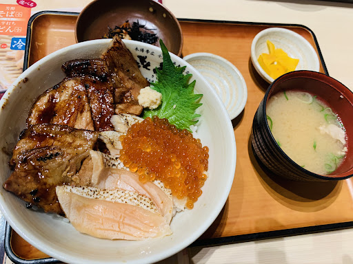 周りに沢山あるお店を見て回っている内にあれもこれも食べたくなってしまい、いいとこ取りできるこちらのお店に決めてお邪魔しました。結果、大満足。大変おいしく楽しい時間を過ごさせてもらいました。 私は北海道味比べセットを頂きました。6種の中から選んだ小丼2種とざるそばのセットで、ローストビーフ丼とサーモン丼を選びました。連れは豚丼と唐揚げのセットを注文しました。食べたいものをなかなか絞れなかったので、二人で分け合って5つのメニューをシェアできて大変満足です。加えて+490円でお惣菜ブッフェも付けたので、食べた料理、食材の種類はとんでもない数になりました。 豚丼、サーモン丼、ローストビーフ丼と、丼メニューは3種頂きました。どれもおいしかったですが、やっぱり「豚丼専門店」を銘打つ事もあって、豚丼のおいしさが抜きん出ていました。お肉も柔らかかったですし、豚の蒲焼としての味付けもしっかりしていて、でも濃すぎず、好みでした。 唐揚げも衣がしっかりしていておいしい! 豚丼&唐揚げのセットは最強でした。 お惣菜ブッフェはお惣菜数種とサラダ、おでんとプリン系2種が食べ放題でしたが、こちらも満足度は大。お惣菜は味の濃さを抑えめでさっぱりしているものが多く、メインの食事を台無しにしないよう添え物として丁度の味付けになっていました。おでんはひとつひとつの具が小さめで、これもありがたかったです。唯一、サラダのドレッシングが個性的で結構辛く、いくつか選択肢があればなと思いました。 また、店員さんもそれぞれとても個性豊かで自由な空気が感じられ、お店の雰囲気もよかったと思います。メニューも多く、...