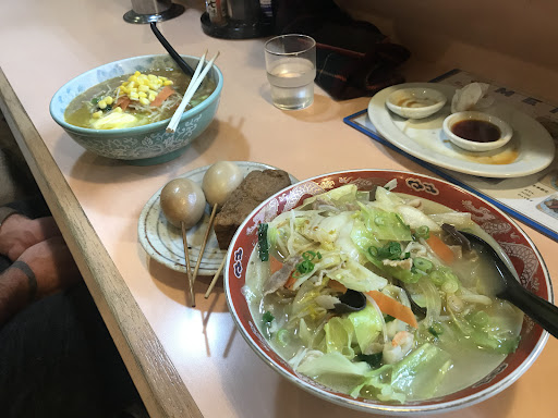 Our hotel was just down the road so we thought we’d try this place for dinner. Ordering was a little difficult with the language barrier but they did have one menu with English. We ordered the butter miso ramen, the pork and vegetable ramen and some gyoza. Gyoza were delicious. The butter miso might be the house fave?? Was rich and delicious broth. My ramen was loaded with veggies so I was happy, even though hardly any pork. You can also get eggs and tofu etc out of a Bain-Marie. Servings were decent size and good value for money. Not traditional ramen at all but we’re both glad to have tried it and if your travelling and craving veggies like I was...