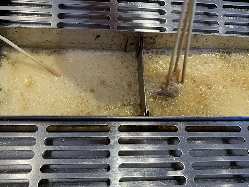 テーブルに持ち帰り、揚げていきます。 ねり粉とパン粉をまとわせ、フライヤーに投入('ω')ノ 一つ一つ食材は小さく火が通りやすいので、すぐに揚がります。