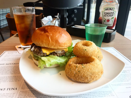 Read moreI got Doug's cheeseburger and recommended onion rings. They were both so good and let me tell you I have never had crispier onion rings. Plus they had a unique umami flavour to them that you don't get with typical onion rings. The food also came out quite fast. I only just finished reading the placemat when my meal arrived. The atmosphere is modern and open but it felt weird to sit right by the window and have passersby look right at you. The price of the burger combo (+ drink and side) was quite pricey, almost ¥2000, but to be fair I came out very full. My waiter was also super polite and even confirmed if I knew Japanese or not before diving into explaining the menu.