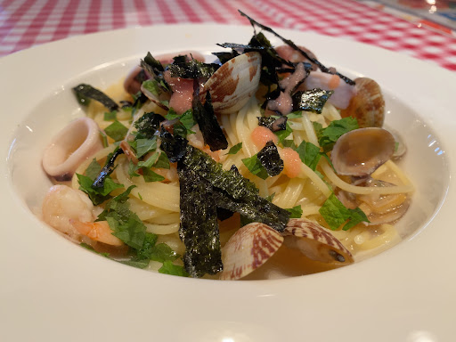 Read moreランチタイムの丁度よい昼時に。とても混雑に近い、けど楽しそうに会話している子連れさん多数。主にファミリーの利用が多いです。一人で入るのは勇気がいる店?僕は一人では入ったことは無いなあ。子供がいても大丈夫な椅子なども置いてます。内装が、とにかく見渡すほど癒やされる!!注文するメニューは決めていたためすぐに頼みました。たぶんメインメニューと番号で伝えても通じるのかも。ワインのボトルも数多く置いてます。品数の多さが、まるでデパートです。値段は味の美味しさで考えると良心的。それにイタリアのママのような家庭料理的な味付けで最高でした。カルボナーラはチーズも卵も塩気の良さからライスを別で頼んでツマミとして追加で食べたいくらい、うまし!!ピザは釜ではなくオーブン調理のようですが厚みと焼き加減がママを思い出す優しい味。ゴルゴンゾーラとハチミツの大きいサイズながら僕的に一人前。普通の人なら二人前以上のものが、お得に食べられる。ショーケースにはデザートも並べられていたり外にもオシャレなディスプレーで次々と食べに来られる方を見たり幸せな時間でした。水をこまめに注ぎに来てくれたウエイトレスさんの制服とか可愛くて愛想良いのです!!広島と言えばマリオ!?いつ食べに行っても美味し...