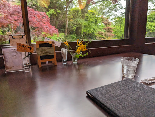 The rain came suddenly and with no sign of stopping, my spirits and socks were damp. The kind hospitality and view of the beautiful garden with koi swimming and a small bird playing filled me with a sense of peace. After a long time, when the rain finally slowed, I continued my day and enjoyed the shrine with renewed spirits. Thank you for lifting my spirits on a rainy day, because of you I was able to enjoy the beauty of the nearby shrine. I will always recommend people stop in here when they are in the area. Thank you as well, for accommodating my strange request for an iced latte.