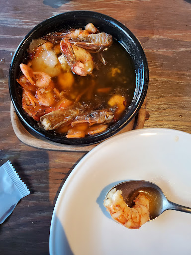 Mind you it's cold outside so I go with ajillo, which is famous Spanish soup dish that often comes with bread and oil fragrant rich soup filled with shrimps.
