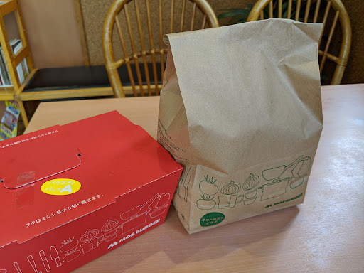 Mos Burger take-out is served in paper bags + containers, say no plastic packaging. If you eat-in they have reusable containers. The board outside shows where daily vegetables are sourced from in Japan.