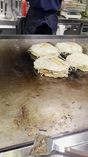 From the moment I walked in, I was impressed by the cleanliness and organization of the kitchen. The chefs work methodically and skillfully, layering fresh ingredients like cabbage, noodles, and pork slices onto the grill. You can see the attention to detail in the photo — each okonomiyaki is perfectly portioned and neatly stacked, ready to be cooked to perfection.