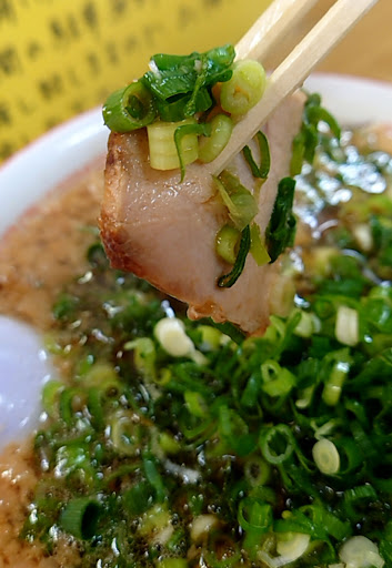 スープをレンゲで掬うと大量の背油と青ネギが入って最高に美味い。背油の香ばしい旨味とネギのシャキシャキとした食感。麺に行きつく前に延々とスープを飲んでしまいました。