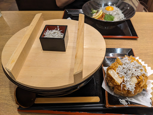 店頭のしらすの写真に惹かれてお邪魔しました。 ふたりで「生しらす釜揚げしらすW丼」と 「しらすのかき揚げのおうどん」を注文し、半分ずつ頂きました。 しらす丼は、酢めしの上に生しらすと釜揚げしらす、生たまごが乗っていて、かつお節、大葉、ねぎ、そしてレモンが添えてありました。とにかくしらすの量が多い! 大きいお皿の真ん中にちょこんと乗ってるように見えて、実際には結構高く盛っていて、ごはんの量もそこそこあるのに上から見てごはんが見えないくらいしらすがたっぷり。そして、このしらすがうまい! 生しらすは少し時間が経ったり輸送の方法が悪いとすぐに匂いがするイメージがありますが、とても新鮮でおいしかったです。釜揚げしらすもふわっふわでした。ついてきたお醤油は私にはかなり甘過ぎて折角のしらすの味がもったいなかったので、レモンか何もなしで頂きました。最高でした。 おうどんは、大きなどんぶりに釜蓋がどーんと載っていて、更にその蓋に釜揚げしらすの入った桝形の器が載って出てきました。インパクト、大です。おうどんは甘く濃い目のお汁に柔らかい細麺でした。かき揚げが別のお皿で出てきて、好みのタイミングでうどんにつけられるのは嬉しかったです。が、かき揚げがめちゃくちゃおいしくて、ついに最後までうどんにつけずにかき揚げだけで堪能しました。衣がパリパリ、たまねぎがホロホロ、サイズが大きくて飽きるかと思ったのに、最後までおいしく頂きました。 しらすとかき揚げ、このふたつでこんなに感動したのに、これでふたりで税込2000円いきませんでした。コスパ、よすぎです。 お店の雰囲気も店員さんの対応もよくて、とても気持ちよくおいしく食事...