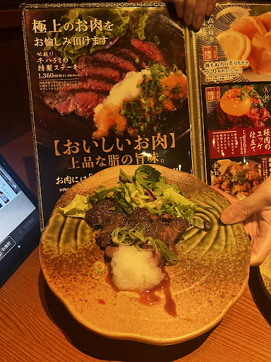 Read moreNet bij het restaurant gegeten. Het zijn kleine porties voor redelijk veel geld. Er is reclame voor twee van hun top producten, de vleesspiesjes en het gegrilde rundvlees wat volgens het restaurant gelukshormonen zou produceren als je dit eet. Maar...het eten kwam niet tegelijk dus de een was al klaar en de ander had geen eten. Het eten was verder niet bijzonder en zeker niet als je zulke verwachtingen schept in je advertenties op je menu. Er stonden 2 dingen op de de rekening die we niet besteld hadden. Toen we daar naar vroegen kregen we te horen dat dat bij de Japanse cultuur hoort. Ja, we zijn wel toeristen maar niet dom hoor. Weet je wat Japanse cultuur is? Dat je restaurant schoner is en dat je vloer niet zo vies is. Minst goede en minst leuke ervaring tijdens de Japan reis tot nu toe. 1 ster. 2 sterren voor service omdat ze ons hielpen met bestellen. Geen aanrader, maar dat was wel...