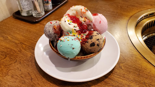 I really like this place for celebrating family birthdays and heavy-eating occasions with other male friends. It's easy to find higher quality, higher-priced 'yakiniku' restaurants, but the appeal here is the great selection of buffet choices, meats and veggies to grill at your table, desserts, ice cream flavors, and drink bar...with 90, 120, and 150-minute value-priced options. Similar restaurants are usually tight on space, come with a 90-minute limit, and feel very rushed. However, this place is spacious and you can enjoy eating slowly here with family...
