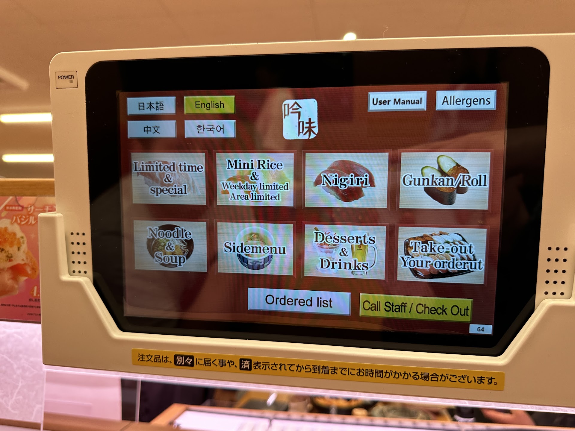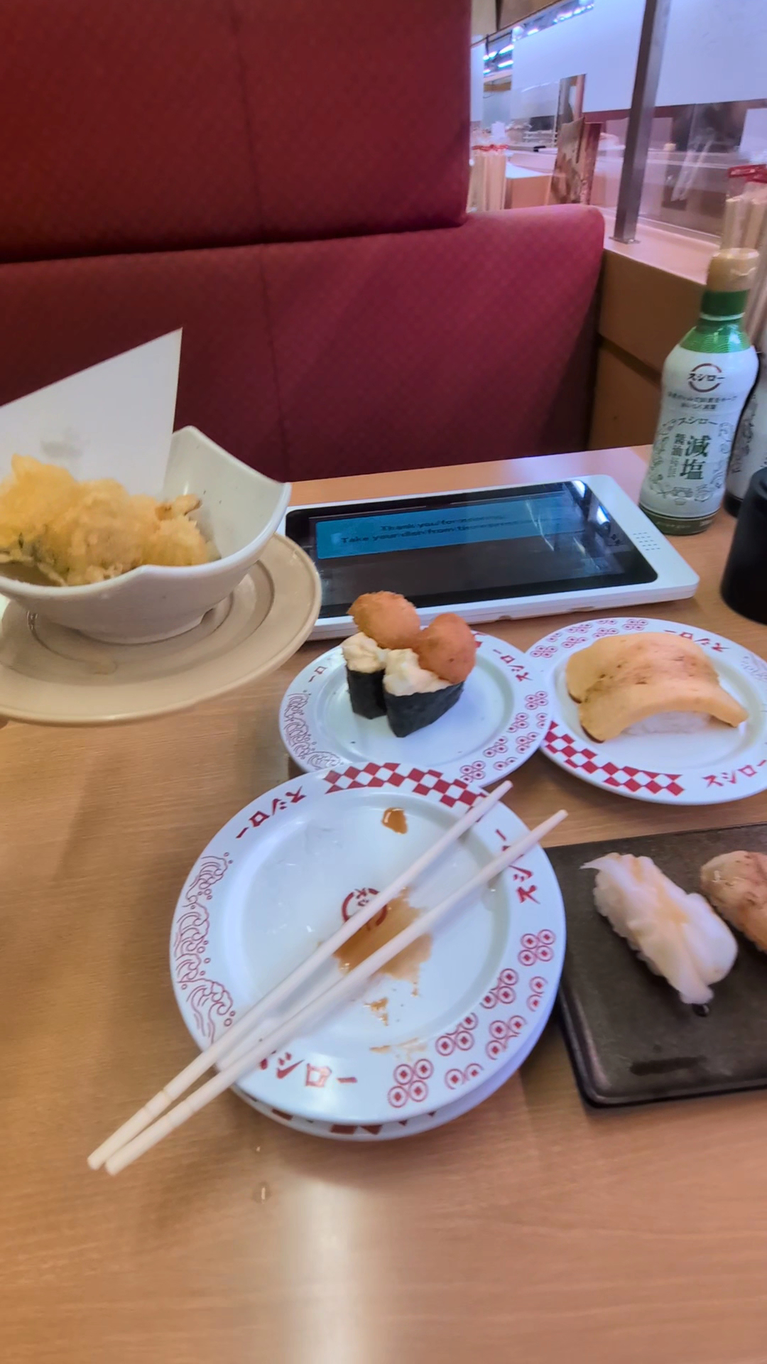 Read moreEnglish menu available to reserve your table when you first go in. Take the ticket with your number and listen or watch the screen. When your number is called you scan the QR code at the check in machine and find another receipt pops out that has your table number. Head to your table and there is an English screen available there too to order your sushi. When we were in Japan 10 years ago they used to have sushi continuously going on the conveyor belt that you could just grab, but now you order everything you want on the screen and it will be delivered to you...