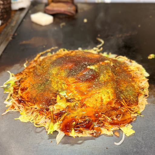 Read more以前インスタで観て気になっており サウナをキメたの後に伺いました お店は車で行くにはかなり覚悟を決めていってください お店はなかなかアットホームな感じ お水はセルフ メニューを眺めるとお好み焼きにサイズが細く分かれており 初めての方はSサイズが推奨されていまいしたが サウナ後なのでMサイズのそばにイカ天と青唐辛子をトッピング まず生地を丸く伸ばした鉄板の横にキャベツ 横に?と思っていたらキャベツを鉄板で炒めはじめ この手法は初めまして そしていろいろな具材が重なりひっくり返されると久しぶりに見た年季の入った押さえ 均等に圧力かけるご主人 そこに半熟玉子とドッキングし裏返り目の前へ Mサイズは20cm位の大きさ ヘラでカットしそのまま口へ 水分がいい感じで抜けたキャベツが甘い 途中、七味やニンニクパウダーなどを試しながら黙々と食べ進める 気がつくとサウナの後なのに顔面が汗だく オールドスクールの様でそれだけではないと感じた お好み焼き体験で...