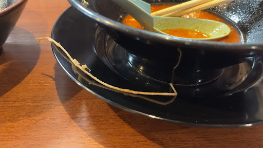 ここの接客には全然期待してないんだけど… 本日乗ってたチャーシュー、やけに小さいな?と思いながら口に入れたら変な歯応えが。 すぐに気付いたので口の動きを止めて違和感の正体を取り出す。 チャーシューの端っこだったんでしょうか。 そこそこの長さの凧糸が出てきました。