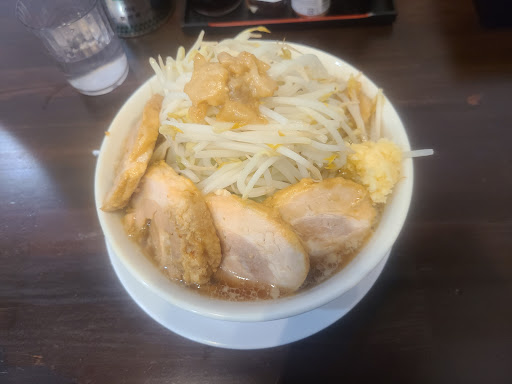 Read more土曜日のお昼に来店しましたが、お客さんはそんなに入っておらず、すぐに席につけました。 にんにく、ヤサイ、アブラ、カラメの無料トッピングがあったので、二郎系みたいですが、そこまで二郎感はなかったです。 注文はラーメン(1050円)でヤサイマシマシ、にんにく普通、アブラ普通で注文しました。カラメに関しては卓にあるタレを自分で追加する形式でした。 スープや麺はジロリアンの方からすると、物足りなさを感じるかもしれません。 私個人の好みとしては結構好きな味でした。 スープはかなりあっさりしていて、塩味もちょうど良かったです。麺は他の二郎系ほど太くはなく、小麦の粉っぽさはなかったです。麺に味がよく染みていて美味しかったです。 チャーシューは一枚入っていて、そこまでほろほろではなかったですが、普通に美味しいといった感じです。 二郎系としてはこちらのお店に行くのはあまりお勧めはしませんが、普通のラーメンとして食べる分には良いかもしれません。 あと、X(Twitter)でお店の固定ポストをリポストすると、味玉or大...