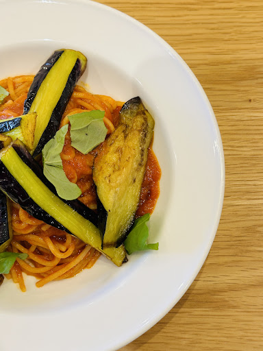 The food here is vegan and almost Halal (though not certified), as they don't use any animal products or alcohol in their cooking, making it suitable for Muslim diners. I tried the Pomodoro pasta with tomatoes and seasonal vegetables, and I found it delicious. The freshness of the tomato sauce really stands out, and I particularly enjoyed the eggplants paired with the spaghetti.