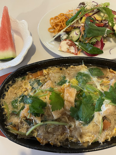 Read more久山のかなり奥まったところにある小さなお店ですが中はテーブルも座敷もあって結構広いです。日曜日のお昼2時過ぎですが次々とお客さんが来店されて人気のほどがわかります。メニューも豊富でケーキセットも気になりますが今日は日替わりランチ(800円)にしました。接客も丁寧で好感が持てました。 待つ間もなくすぐにサラダとデザートのスイカが到着。サラダは自家製らしく新鮮でボリュームもあります。食べているとメインのチキンカツの卵とじ鉄板焼きが来ました。甘めの味付けですのでお子さまにも喜ばれそうです。チキンカツもカリッと揚げられて香ばしいです。これにライスと味噌汁がついてきました。ライスは何とこの値段でおかわり可能です。最初は少ないかなと思いましたがどうしてお腹いっぱいです。こちらは季節のフルーツを使ったケーキが売りのようでショーケースにたくさん並んでました。このお店はクルマでないとアクセスがたいへんなことが唯一のデメリットですかね。でもとても美味しかったで...